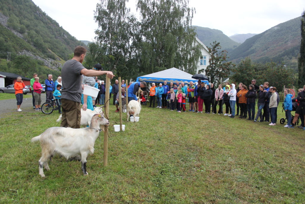 Meanwhile, in the at the finish line in the valley of Norddal, both trekkers, runners, and others got the opportunity to take part in the “Farmen-challenge”. As a part of this, people got to compete against former contestants of the popular TV-show “Farmen”. Axe throwing and the sledgehammer were both popular activities, but the main event was if wether the participants were able to milk a goat. In the end, the local hero, Ola Grønningsæter won the duel.